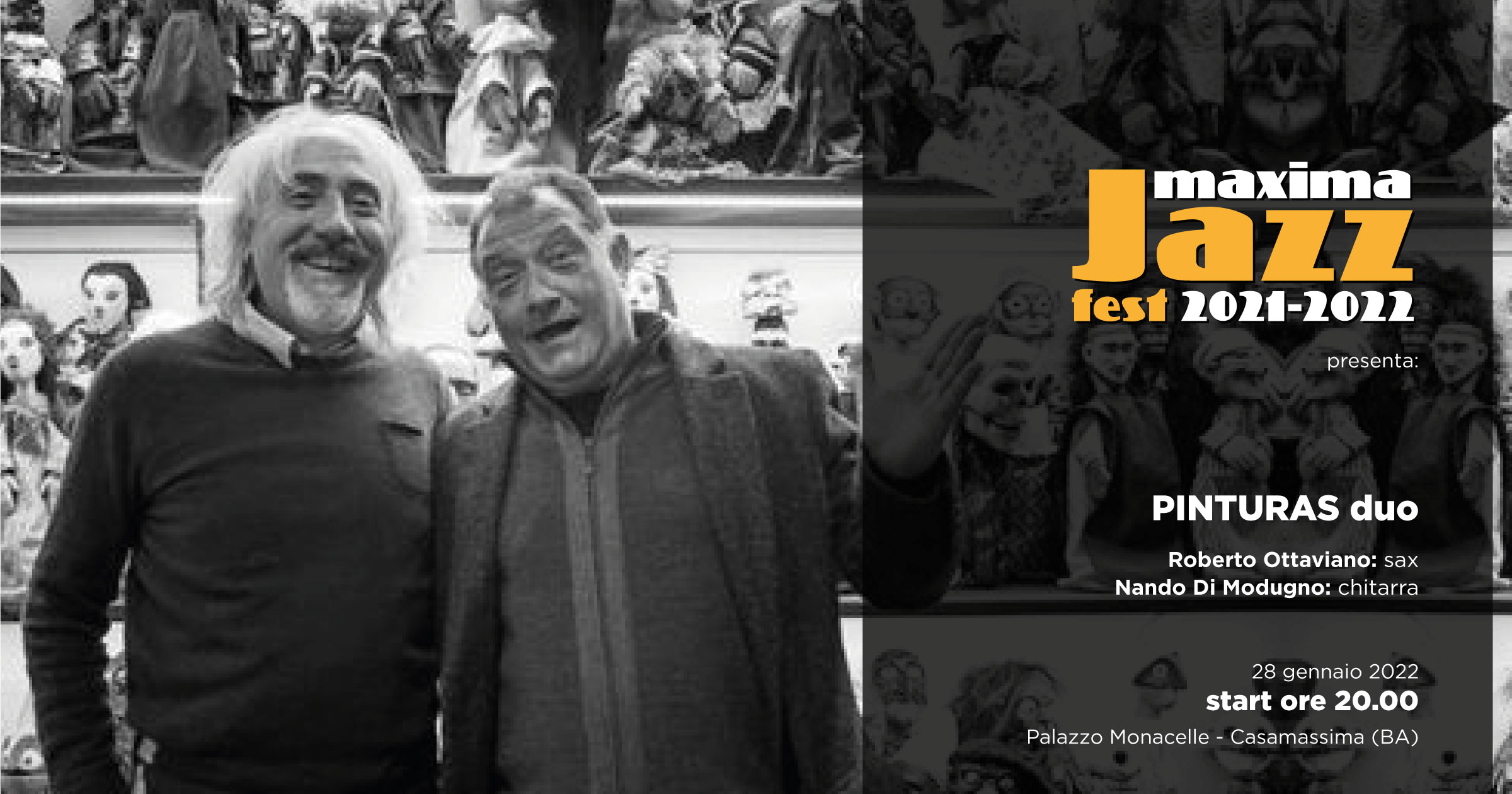 Prosegue la prima edizione di Maxima Jazz Fest, in programma a Casamassima (Bari) fino al prossimo aprile e dedicata ai più grandi artisti jazz italiani e internazionali. Venerdì 28 gennaio, alle ore 20, si esibisce “Pinturas duo”, Roberto Ottaviano al sax e Nando Di Modugno alla chitarra renderanno omaggio a diversi artisti, da Ravel a Veloso, da Towner a Shankar. L’appuntamento è alla Bottega d’arte LaCàst (via Sammichele, 87/89).